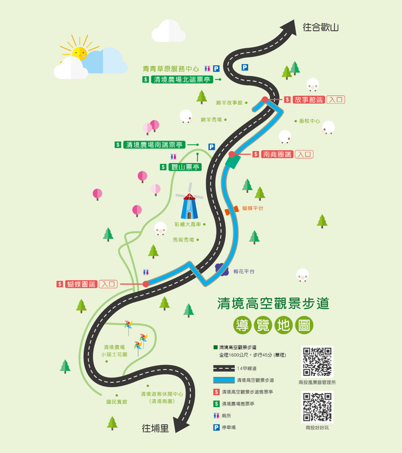 它連接了現有的從清境國賓館到清清草原五五階步道。步道以友好的自然環境和景觀為基礎,並被隱藏起來與穿梭於森林頂端。同時,遊客可以觀賞在綠草地上覓食的羊群生態和在冠層上跳躍的野鳥的生態。途中還有多個景觀平台,方便乘客停下來迎客。 在涼爽的微風中,俯瞰著中央山脈,卓水溪流域,並看到比平原更清澈的藍天。